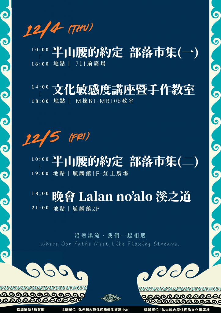 弘光科技大學原住民族學生資源中心與原住民族文化推廣社將共同舉辦 「半山腰的約定—部落市集」 及 「晚會—溪之道 Lalan no‘alo」原住民族文化展演等活動,透過市集、音樂、舞蹈與文化展演,帶領大家深入體驗原住民族的多元與美好。