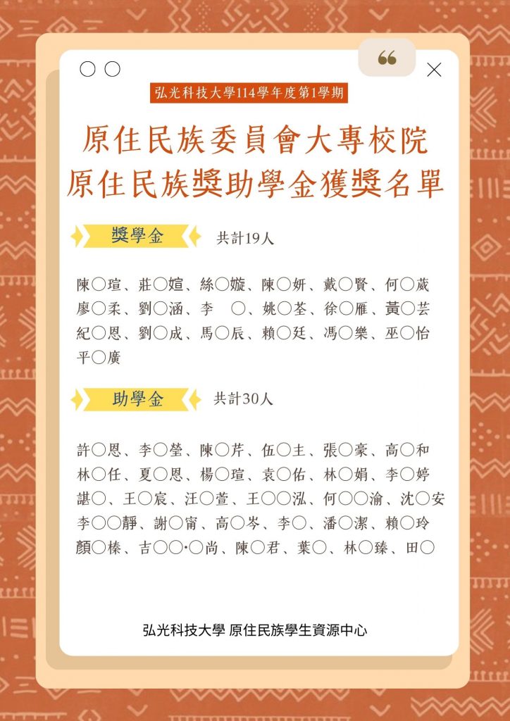 114-1學期原住民族委員會大專校院原住民族獎助學金獲獎名單